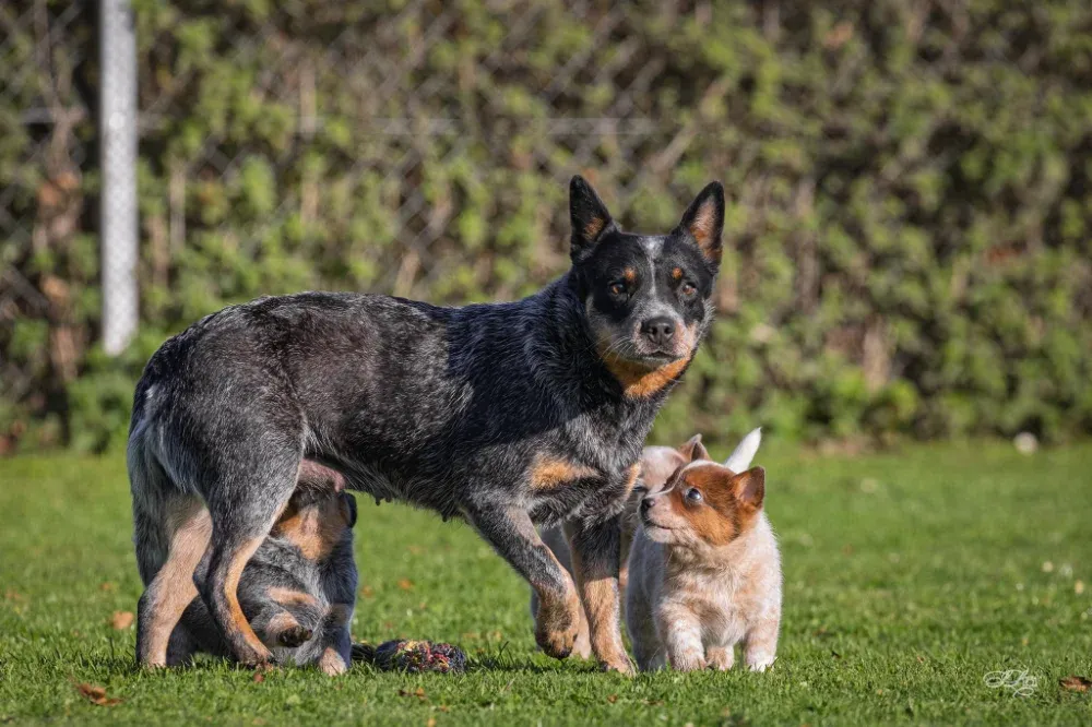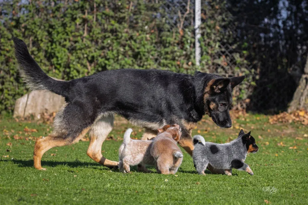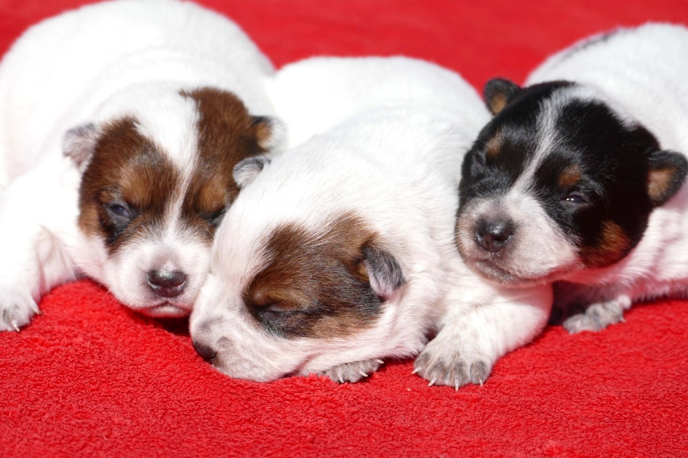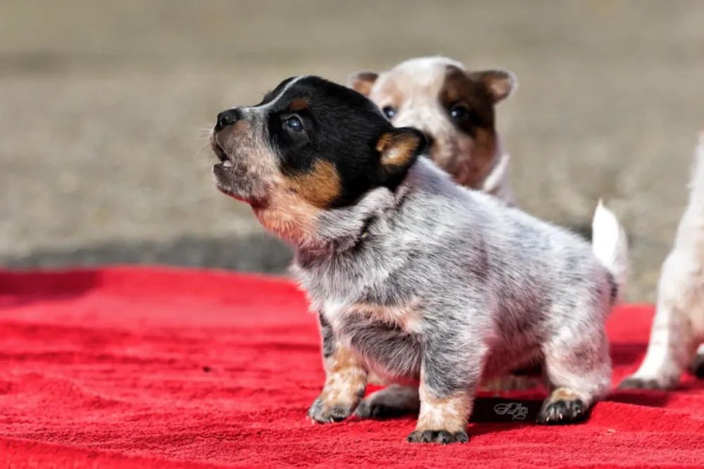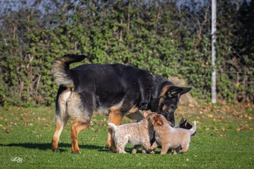 A-Wurf Wurftag: 22.09.2024 1 Rüde blau, 1 Rüde rot, 1 Hündin rot Welpen 8. Woche Welpen 4. Woche Welpen 2. Woche